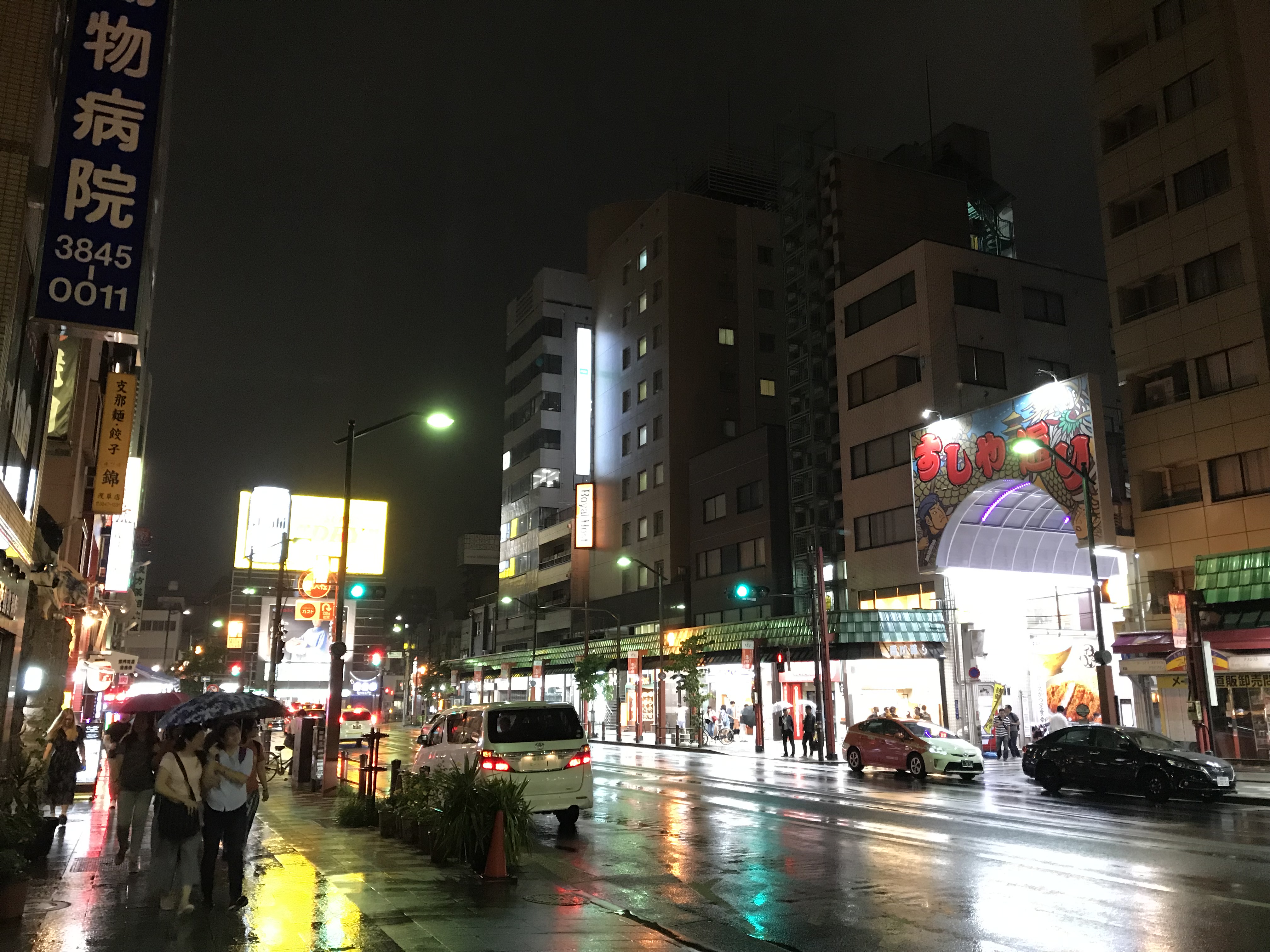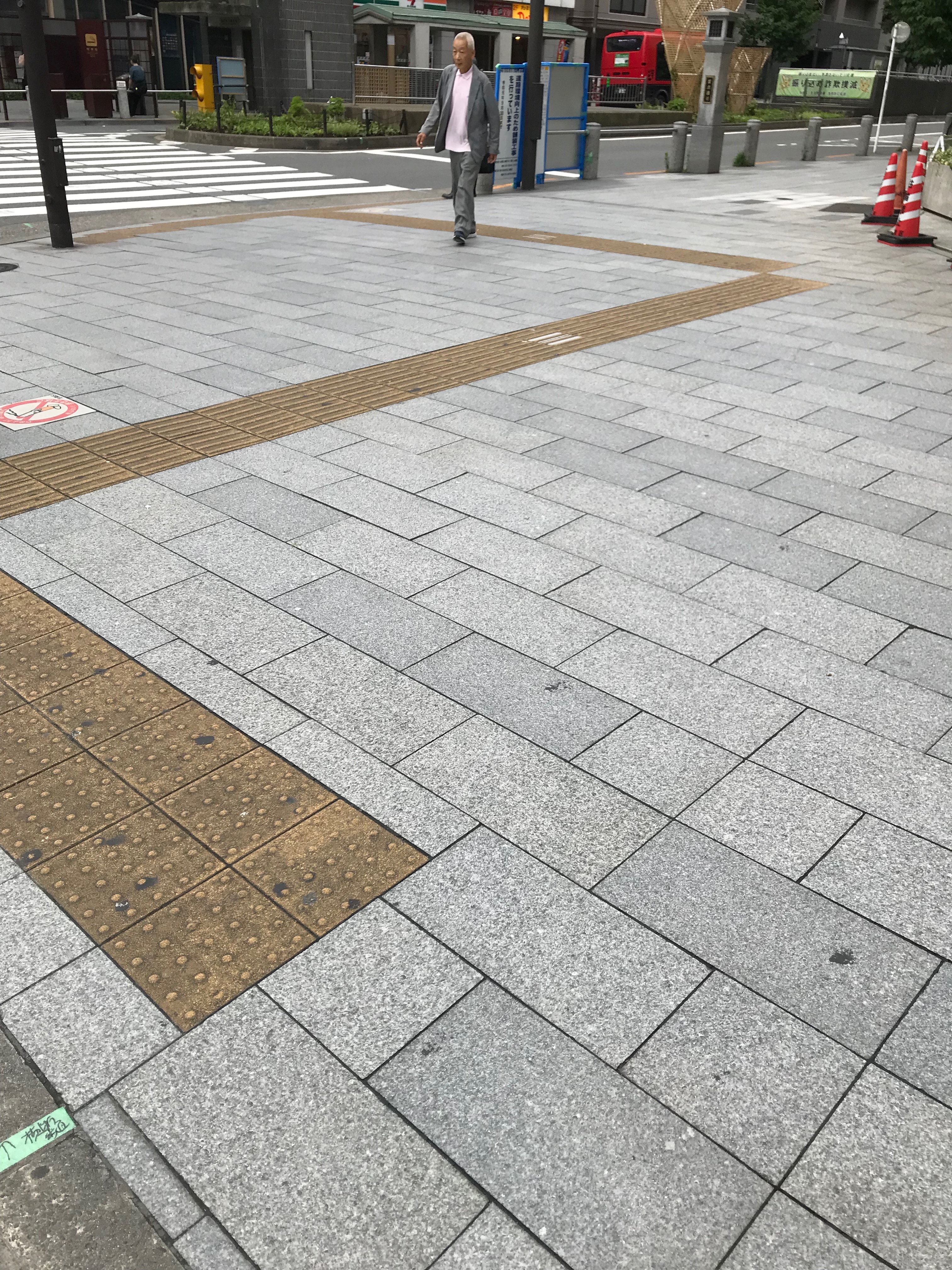 Les rues sont très calmes, presque déserte. Il bruine doucement et quelques piétons se promènent accompagnés de parapluies transparents. (Je n’ai jamais compris pourquoi mais à vue d’oeil de malvoyant, 90 % des japonais possèdent ce type de parapluie pour une raison qui m’est obscure)
