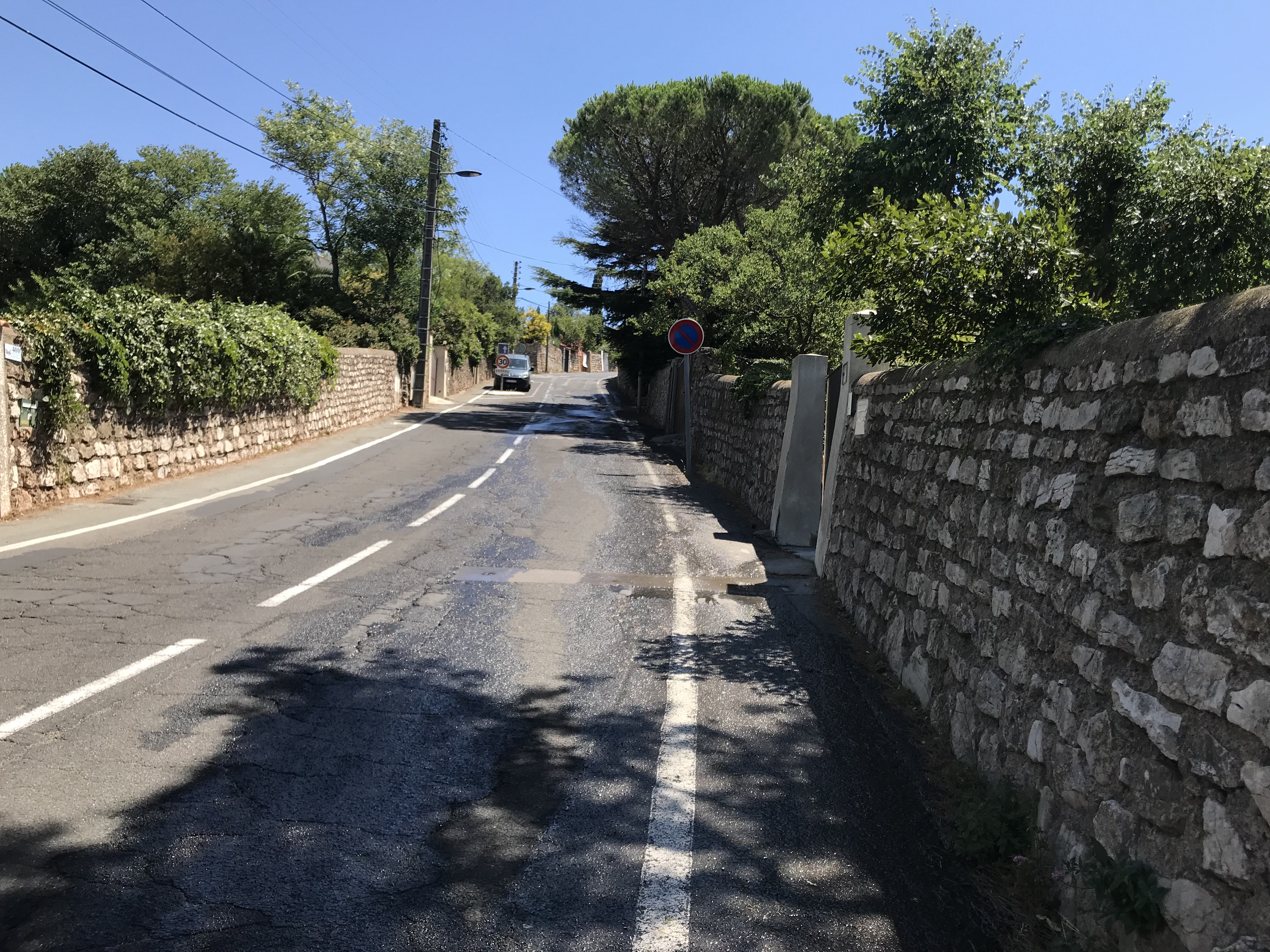 Il faut maintenant redescendre. La gare se trouve à presque une heure de marche selon Google mais c’est en descente ! Je vais pouvoir souffler un peu et je garde précieusement ma canne à ma main droite qui finalement m’aide énormément.